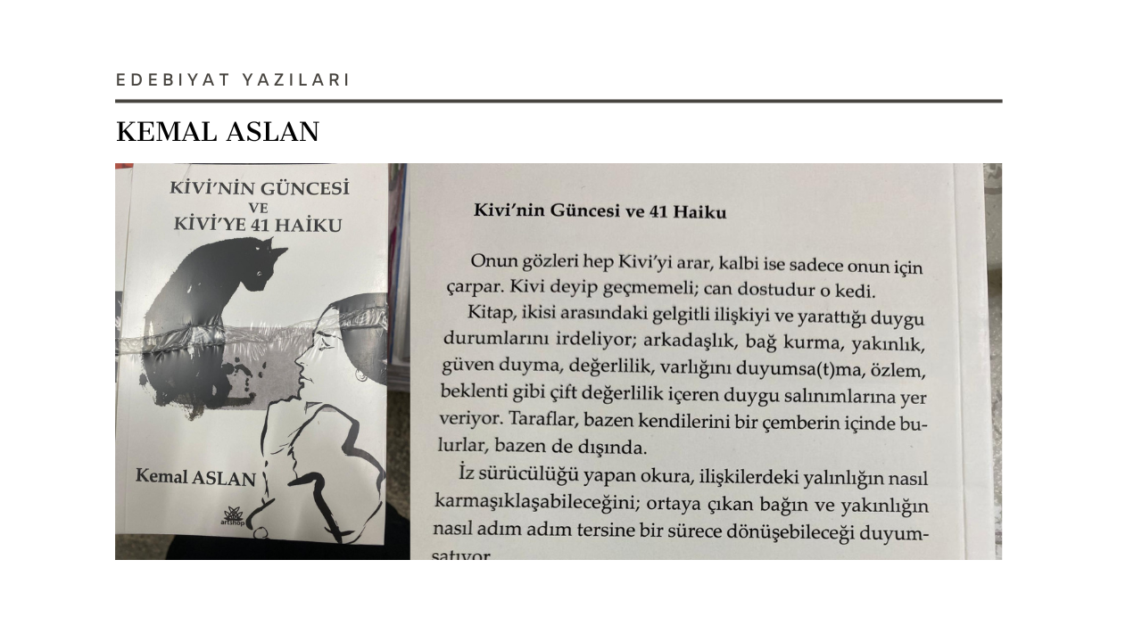 Zorba TV yazarı Kemal Aslan’ın 19’uncu kitabı yayımlandı. 'Kivi’nin Güncesi ve 41 Haiku’ adını taşıyan kitap farklı türde canlılar olsa da her ilişkinin temelinde benzer değerler olduğuna işaret ediyor.