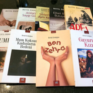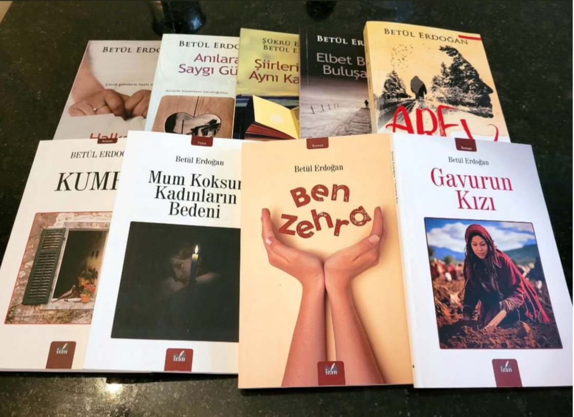 “Halkasız Köleler” yazdığım ilk kitap çocuk gelinlerle ilgili. “Anılara Saygı Günü” çocukluk anılarım. “Şiirleri İçmek Aynı Kadehten” babam ve benim şiirlerimin yer aldığı bir kitap. “Elbet Bir Gün Buluşacağız” yaşanmış bir olaydan yola çıkarak yazdığım bu romanın her satırını yazarken gözyaşı döktüğümü hatırlıyorum. Çünkü bu aşk hikâyesini Bodrum tatilimde tanıdığım bir kadın hayat hikâyesini anlatmış ben de yazmıştım. “Arev’’ bu bir mübadele romanıdır. Yakın bir arkadaşımın babaannesinden duyduğu olayı anlatmasıyla kaleme alıp yazmıştım. “Kumru’’ köyde, kalabalık bir aile içinde yaşayan, okumak, hayata atılmak isteğiyle yanıp kavrulan küçük kız çocuğu çocuk gelin edilerek Almanya’ya gönderilir. Artık onu zor bir hayat bekliyordur. “Mum Koksun Kadınların Bedeni” gene kadın ağırlıklı kısa etkili öyküler. “Ben Zehra” çocuk yurdunda büyümüş bir kız çocuğunun hayat hikâyesi. “Gavurun Kızı” Kurtuluş Savaşı sırasında düşman askeri tarafından tecavüze uğrayan bir kadından dünyaya gelen Hesna’nın hayat hikâyesi.