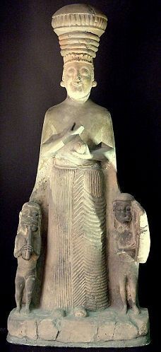 Boğazköy Kabartması ise Tanrıçanın iki yanında duran ve biri flüt diğeri lir çalan iki çocukla betimlenmiş olması nedeniyle özel bir örnektir. Vücudu tamamen önden gösterilmiş biçimde dimdik, kolları genellikle gövdesi üzerine çaprazlama kıvrılmış olgun bir kadın olarak betimlenen tanrıça, başından ayaklarına kadar oldukça kapalı ve vücut hatlarını göstermeyen bir giysi içindedir.