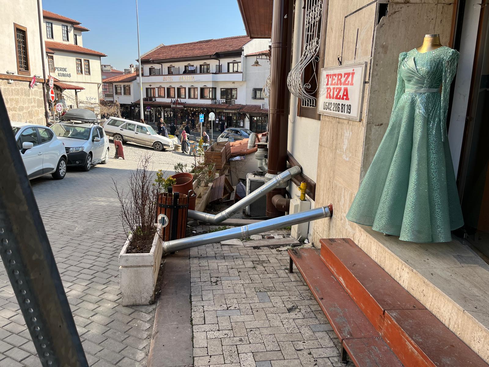 Bu yazının yazılmasının nedeni ise, 3 tane fotoğraf. Onları Şubat ayı içinde Türkiye nin ve Ankara nın “gözbebeği” olması gereken Kale bölgesinde çektim.İlk iki fotoğrafda,Kale ye Ulucanlardan çıkan yolun kavşağındayız. Yıllardır açık bir yemek mekanı…Önce kaldırımı kullanmaya başladı. Sonra, yan sokağın kaldırımında üstünü örterek kullandı. Sonra yapının yağmur sularının borularını kendi yaptığı ve altını dükkanına kattığı mekanın çatısının üstünden doğrudan sokağa bağladı. Aslında bilmeyen biri için, “Kent enstalasyonu veya heykeli” sanılabilecek bir heykelimsi görüntü de yok değil. Sonuçta, kamunun alanlarının bireylere yasaklanmasını da geçtim, artık sokak taciz altında. Ben mekan sahibine bir şey demem…İnsanız deneyebiliriz. Ama kamu bunun için var. Birlikte yaşamanın kurallarını kontrol için yetkilendirilen o. Kamu yani Kent Yönetimi veya Bakanlık elemanları her gün oralardalar. Kamu bu durumu nasıl olurda doğalmış gibi kabul eder?