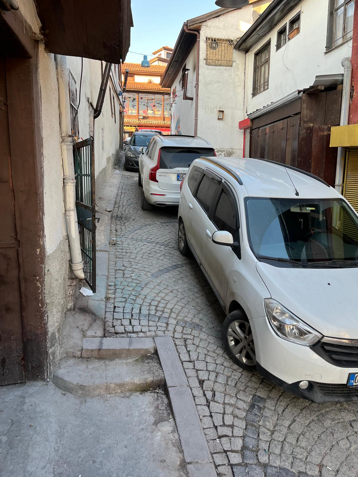 Ya da sokağın otopark olarak kullanıldığı diğer fotoğraf. Çekildiği yer Kale nin en önemli kullanım mekanlarından olan Pilavoğlu Hanının arka sokağa bağlandığı ve Atpazarı sokağa da bağlandığı yer. Üç araba sokağa öyle rahat park etmişki, diğer sokaklara yürüyemiyorsunuz. Hani denedim… Bunu yapankişilerin kent kültürü ayrı, kamu niye kontrol edemiyor? Tabii bu durumun peşinden gelen sorular da gündeme giriyor. Kale ye gelenlerin yeterince otopark gereksiniminin veya yayalaştırma planlamamasının Kamu veya Kent Yönetimince yapılmaması nasıl böyle rahatça ve sanki doğalmış gibi kabul ediliyor?
