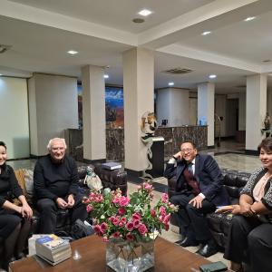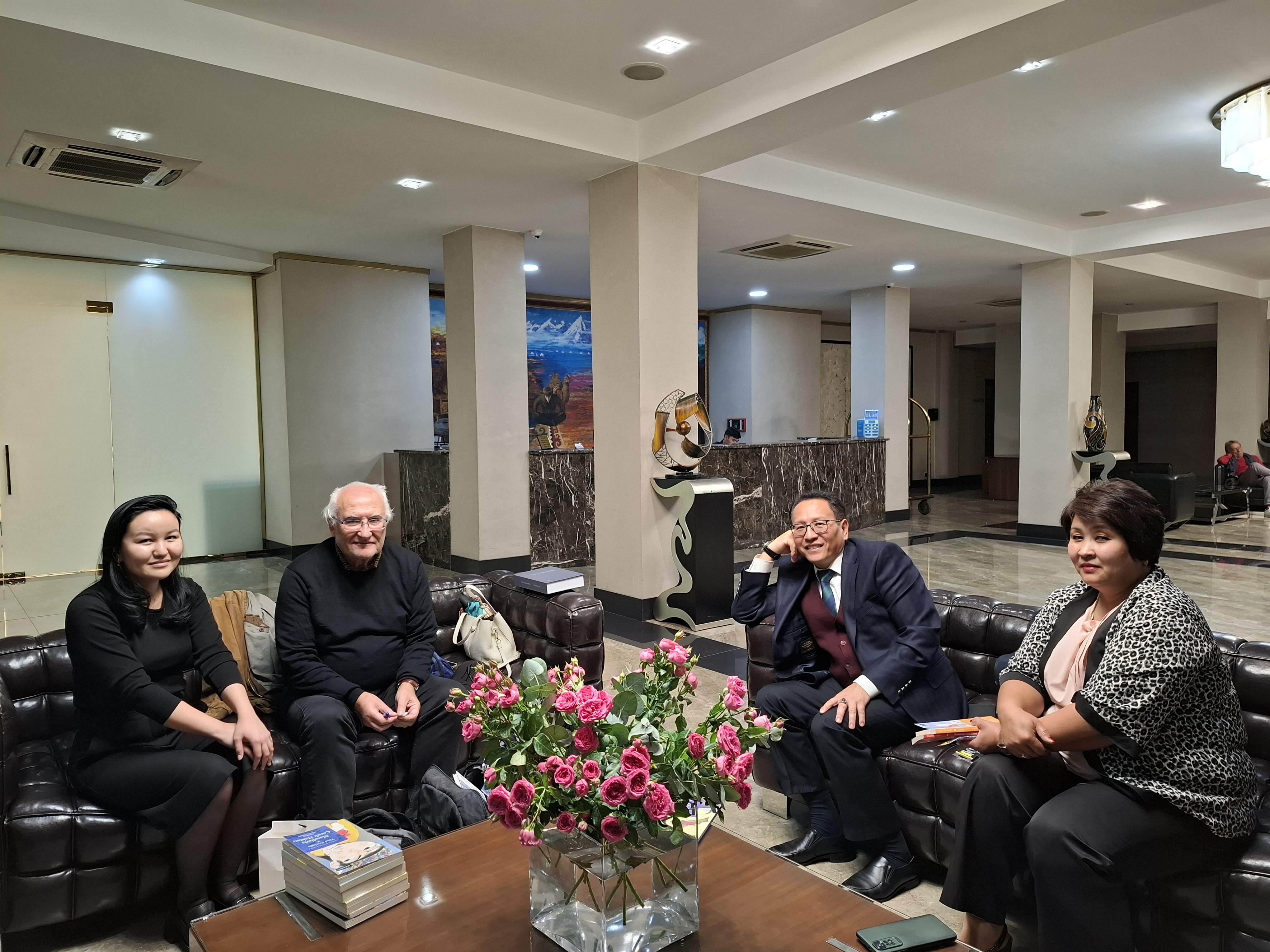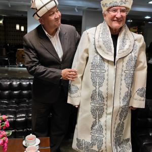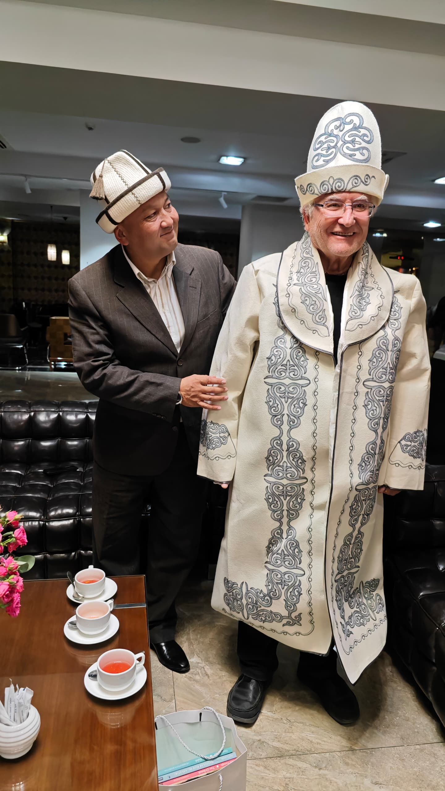 Heyecanla buluştuk. Toplantımıza filoloji bilimleri doktoru, hikâye anlatıcısı değerli kardeşim Bakchiev Talantaaly, Filoloji Bilimleri Adayı ve edebiyat ve folklor ansiklopedisi yöneticilerinden sevgili kardeşim Mukhanbetova Zhurs, yine aynı ansiklopediden koordinasyonu başarıyla yürüten sevgili Berment Amangulova, sevgili çevirmenim KKÜ'den Sabyrbek kızı Nurkız katıldılar. Toplantımız saatlerce sürdü. Ortak neler yapabiliriz diye tartıştık. Filolojiden arkadaşlar çocuklar için Manas ansiklopedisi yayınlamışlar. Manas’ı batıdaki çocuklar için nasıl hazırlayabiliriz diye sordular, tartıştık. Bizde de keşke bir Köroğlu ansiklopedisi olsaydı. “Er Tapıldı” ansiklopedisini hediye ettiler. İçinde benim çalışmalarım da yer alıyor. Sonunda bana sürpriz yaptılar. Aman Naamatov;un önerisiyle büyük bir incelik göstererek bana “Orta Asya Aksakalı” kaftanı giydirdiler. Bu yüce davranışları beni hem duygulandırdı hem de onurlandırdı. Sorumluluğum birkaç kat arttı. Kendilerine teşekkür ederim.