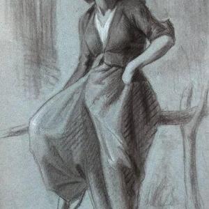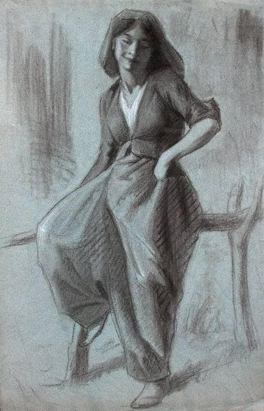 Özellikle Avni Lifij, desenlerinde figürleri betimlerken de gerçekçi ve ayrıntılı bir yaklaşım kullanır. Lifij, figürlerin yüz ifadeleri, giysilerin dokusu ve beden hareketleri gibi ince ayrıntılara özel bir hassasiyet gösterir. Anatomiyi doğru bir şekilde kullanarak figürlerin vücut hatlarını kusursuz ve gerçekçi bir şekilde betimler. Dahası figürlerin yüz ifadeleri belirgin bir şekilde aktarması karakteri hakkında ipuçları barındırır. Bu figür çalışmasında Lifij çizgiyi daha çok lekesel biçimde kullanarak figürün ana hatlarını gerçekçi bir tavırla resmetmiştir. Figürün üzerindeki kıyafetleri ustaca işlemiş ve kumaşın dokusunu ayrıntılı bir şekilde betimlemiştir. Mekân belirsiz bir şekilde betimlenmesine rağmen derinlik oluşturulmuş ve bir dışmekânda olduğu izlenimi vardır.Figürün konumlanış biçimi, ağaç parçalarından oluşan bir düzenekte yarım bir biçimde oturduğu anlaşılmaktadır. Lifij, figürlerin pozlarını ve beden dilini ustalıkla kullanmasının ötesinde yaşam dolu ve dinamik bir şekilde betimlediğini görebiliriz.Burada Lifij, daha çok akademik bir desen ortaya çıkarmıştır. İçerikten çok biçimsel olarak tasvir ettiği bu deseninde köylü genç bir kadın olduğu üzerindeki kıyafetlerinden anlaşılıyor.