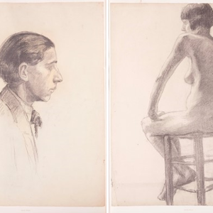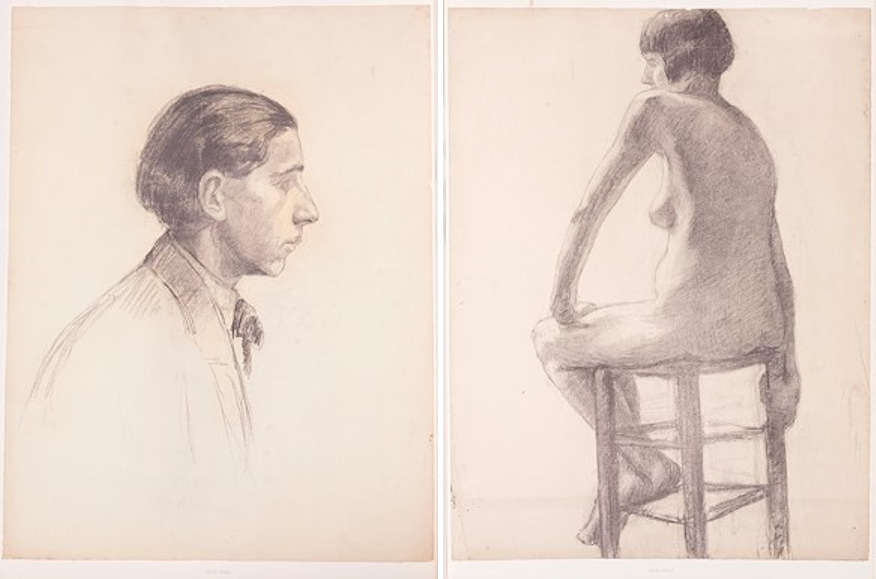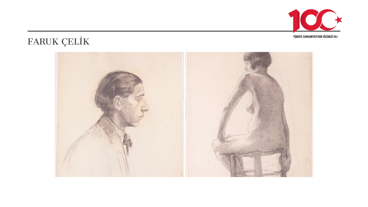 Sağda yer alan figür deseni günümüz akademik çizimlerin ilk örnekleri arasındadır. Bu figür, yüksek bir tabure üzerine konumlanmış çıplak bir kadın figürüdür. Büyük olasılıkla Avrupa’da eğitim aldığı atölyede yaptığı bir desendir. Halil Paşa, atölyede modelin sol tarafında yer aldığı ve kadın figürünün sırt bölümünü çapraz şekilde görebileceği bir açıyla oturduğunu düşünebiliriz. Çizgi kullanımı ışık gölge kurallarına bağlı kalarak daha lekesel ve tonlamaya ağırlık verdiğini kompozisyonlarında görebiliriz. Her iki desende de göze çarpan çizgi kullanımıdır. Halil Paşa çizgileri çok yumuşak bir şekilde kullanarak bedenin zarif dokusunu hissettirmeye çalışır. Her iki çizimde de bu belirgin çizgi kullanımı Halil Paşa’nın özgün bir üsluba sahip olduğunu gösterir.