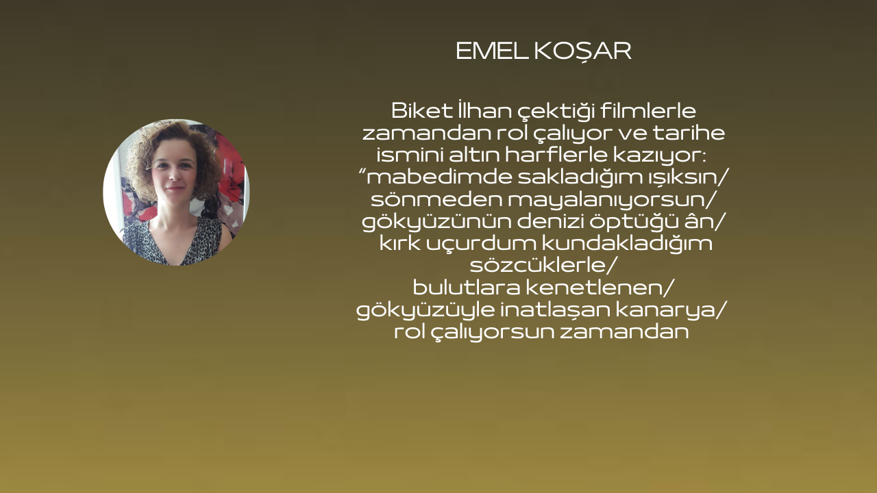 Ona ithaf ettiğim “Dalga Beklentisi” (Mimoza Yangını, Artshop Yayınları, İstanbul 2021) şiirimde de ifade ettiğim gibi Biket İlhan çektiği filmlerle zamandan rol çalıyor ve tarihe ismini altın harflerle kazıyor: “mabedimde sakladığım ışıksın/sönmeden mayalanıyorsun/gökyüzünün denizi öptüğü ân/ kırk uçurdum kundakladığım sözcüklerle/bulutlara kenetlenen/gökyüzüyle inatlaşan kanarya/ rol çalıyorsun zamandan (s. 23)