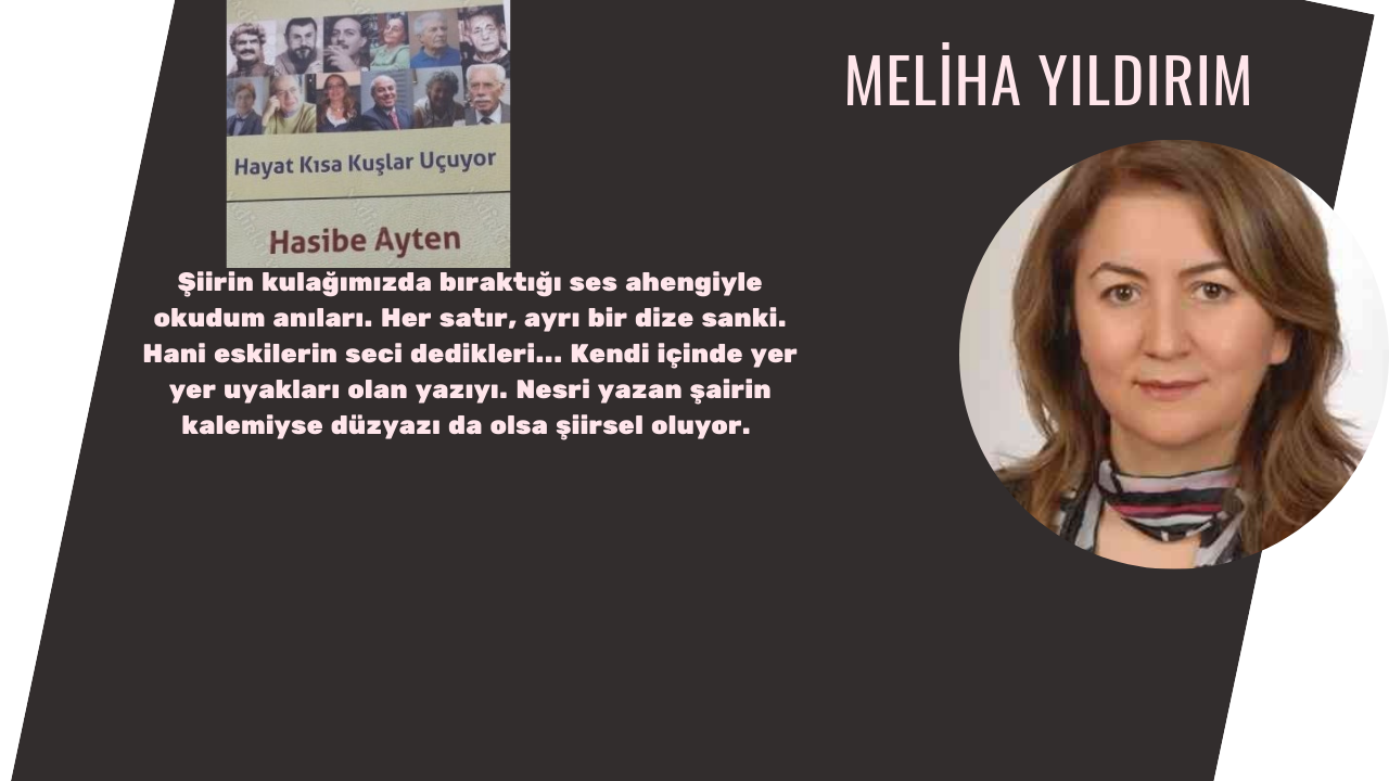 Hayat Kısa Kuşlar Uçuyor, anı-deneme kitabını okumaya başladığımda bir an için yazarı Hasibe Ayten’le sohbet ettiğimi düşündüm. Şiirin kulağımızda bıraktığı ses ahengiyle okudum anıları. Her satır, ayrı bir dize sanki. Hani eskilerin seci dedikleri... Kendi içinde yer yer uyakları olan yazıyı. Nesri yazan şairin kalemiyse düzyazı da olsa şiirsel oluyor. Ayrı bir ritimle okunuyor Hasibe Ayten’in kaleminden dökülenler.