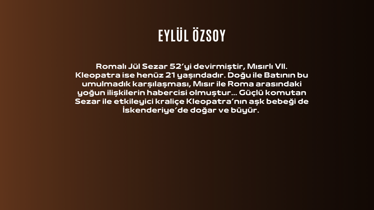 Hediyeyi getiren hizmetkâr, iri elleriyle oryantal halıyı yere indirdiğinde, Jül ilkin aklını kaçırdığını sanır, ardından kendini çimdikler de ancak öyle ayılır. Halının içinden kim çıksa beğenirsiniz? Gözleri kara elmasları, narin duruşuysa bir kuğuyu andıran çok çekici, pek alımlı Kleopatra çıkıvermesin mi halının kıvrımları arasından. Genç kraliçeyi görür görmez, hoşlanmak ne kelime, Sezar önce büyülenir, ardından âdeta hoşafa döner... Tarihler MÖ 48 yılını göstermektedir. Romalı Jül Sezar 52’yi devirmiştir, Mısırlı VII. Kleopatra ise henüz 21 yaşındadır. Doğu ile Batının bu umulmadık karşılaşması, Mısır ile Roma arasındaki yoğun ilişkilerin habercisi olmuştur… Güçlü komutan Sezar ile etkileyici kraliçe Kleopatra’nın aşk bebeği de İskenderiye’de doğar ve büyür.