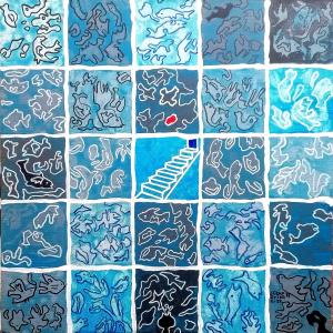 Çeşitli mavi tonların ağırlıklı kullanıldığı birkaç soyut detayın öne çıktığı bir kompozisyonda sanatçı monokrom bir tema ile farklı dokusal unsurlar ekleyerek derinlik ve hareket hissi yaratmış. Parçalanmış gibi duran dikey çizgiler, dokular ve alanların birbirine geçişleri, kompozisyon içinde bir dinamizm oluşturuyor.