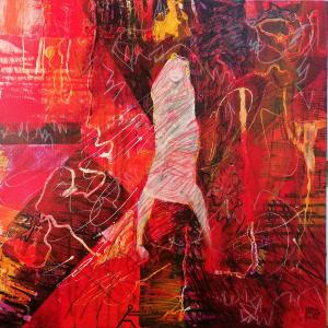 Serap Etike’nin bazı resimleri tam bir dışavurumcu sembolist yaklaşım içinde. Mavi ve turuncudan oluşan zemin üzerinde havada uçuşan merdiven, sandalye çizgiler halinde.