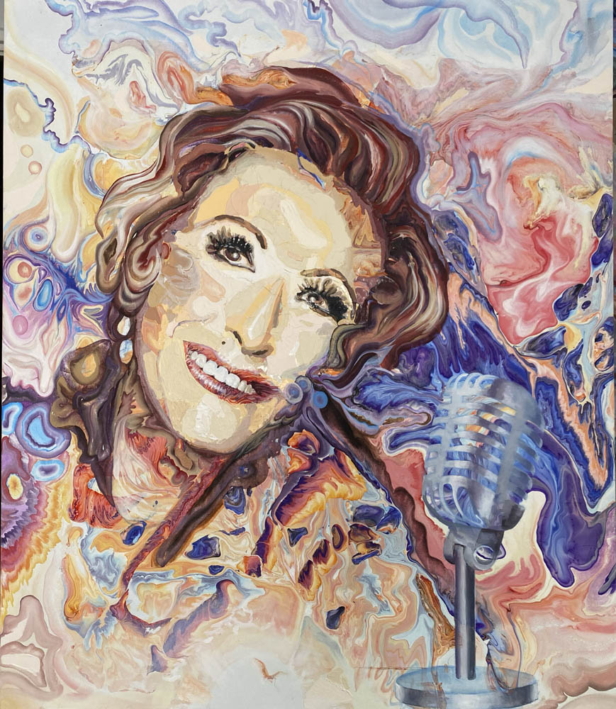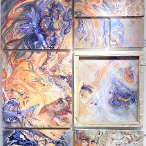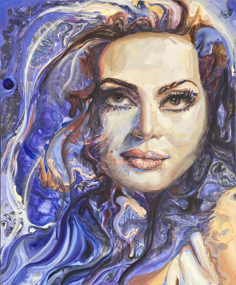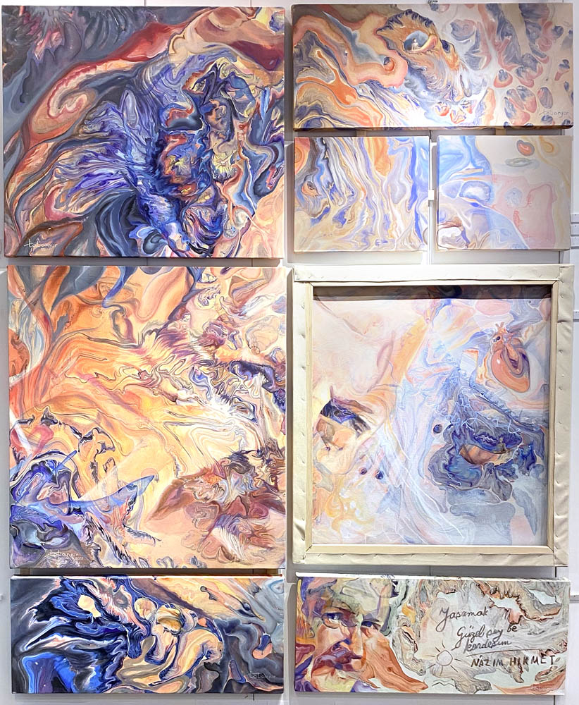 Suyla oluşturulan akışkan dokular ve dinamik fırça darbeleri, enerji ve hareket hissini güçlü bir şekilde yansıtıyor. Bu eserlerdeki portreler, sanki yaşamaya devam ediyormuş gibi bir his uyandırıyor.